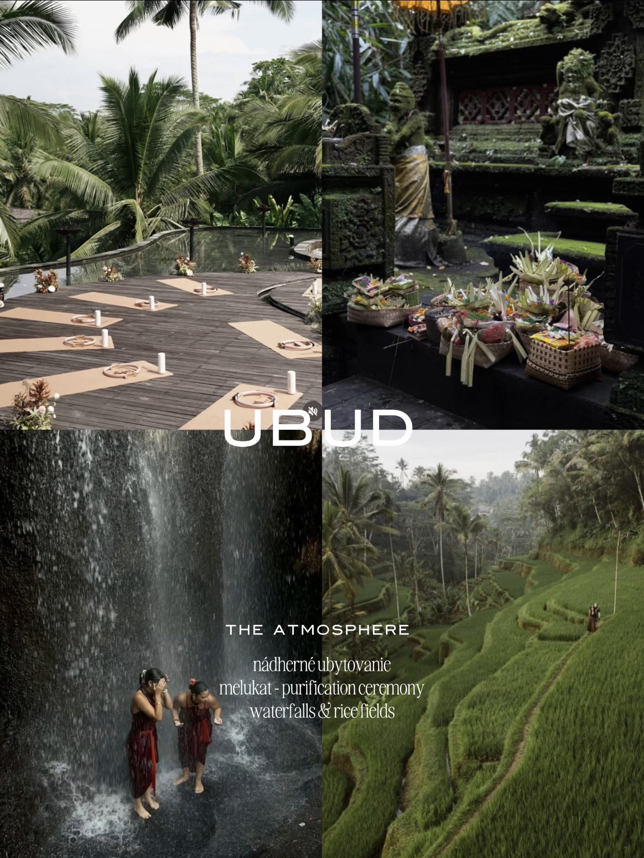 Predstav si, že sa otvoria dvere lietadla a teplý, vlhký vzduch Bali ti pohladí pokožku. Vo vzduchu cítiš vôňu vonných tyčiniek, kvetov a oceánu. Palmy sa jemne hojdajú vo vetre a ty máš pocit, že si práve vstúpila do iného sveta. Sveta, kde čas plynie pomalšie, kde sa dýcha hlbšie a kde sa duša konečne uvoľní.